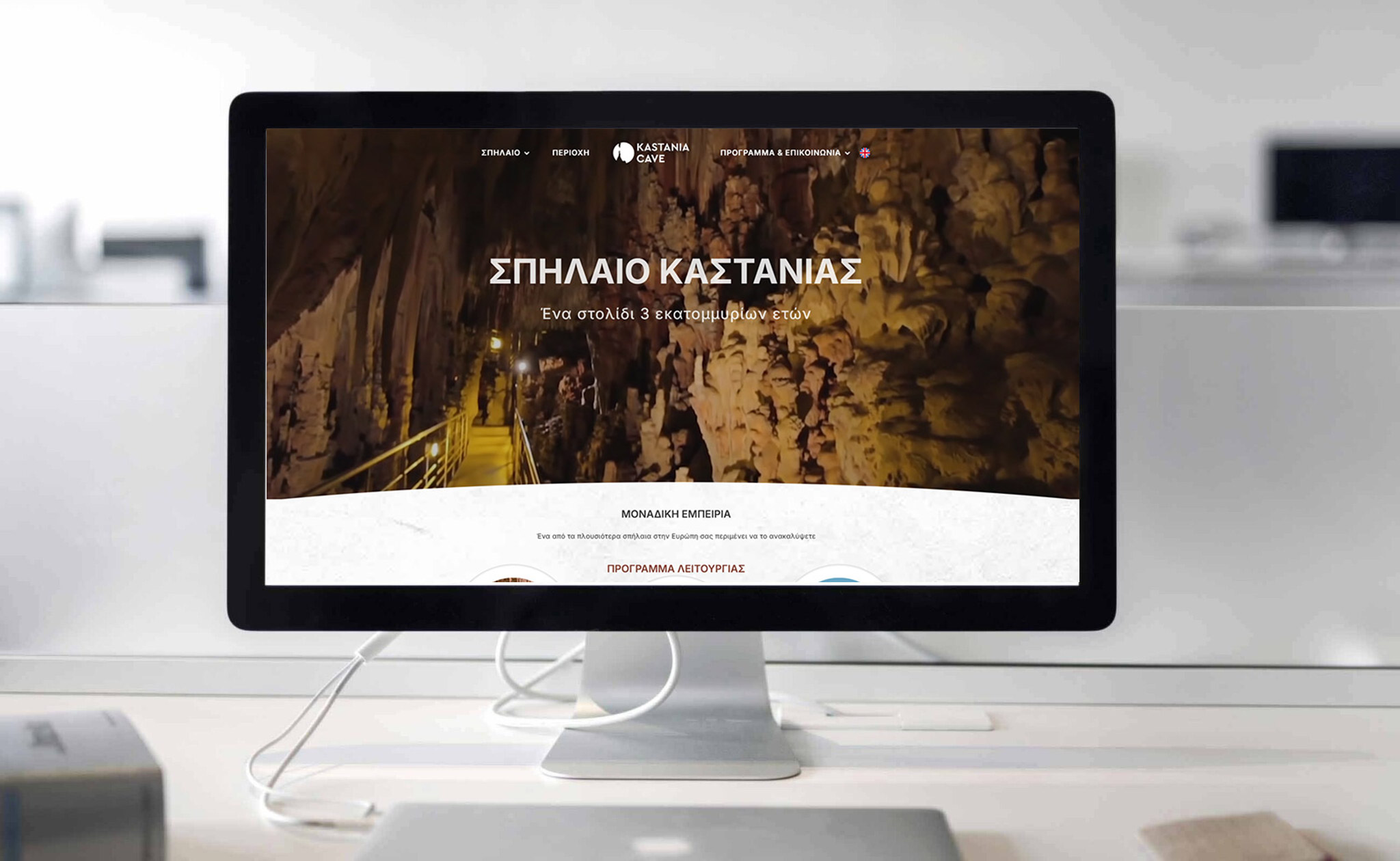 - Σχεδιασμός Λογοτύπου & Branding: Δημιουργήσαμε ένα νέο, μοντέρνο λογότυπο εμπνευσμένο από τους μοναδικούς σχηματισμούς του σπηλαίου, προσφέροντας ένα αναγνωρίσιμο σύμβολο για το φυσικό αυτό ορόσημο.