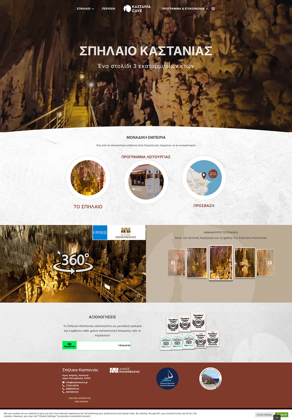 - Ιστοσελίδα (Website Design & Development): Αναπτύξαμε μια καθηλωτική ιστοσελίδα που λειτουργεί ως ο κεντρικός κόμβος πληροφόρησης. Ο σχεδιασμός εστιάζει στην οπτική εντύπωση, παρέχοντας εύκολη πρόσβαση σε πληροφορίες όπως το ωράριο, τα εισιτήρια και η ιστορία του σπηλαίου.